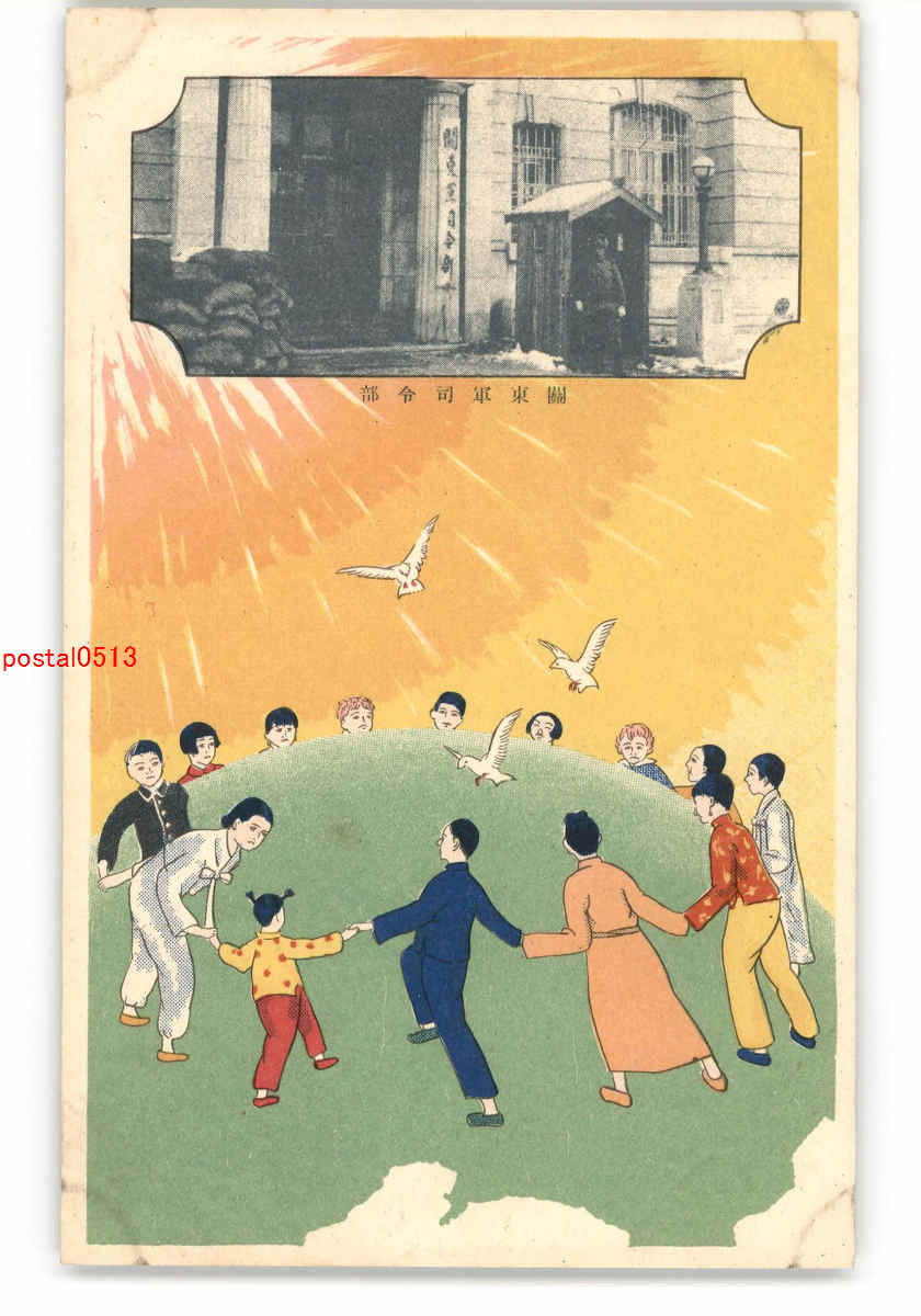 満州 関東軍司令部 世界中の人々が手を取り合うアート絵葉書 *傷み有り