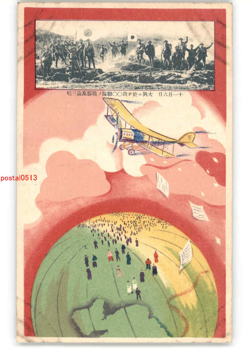 軍隊 大興にて連隊の戦捷万歳三唱 飛行機からビラを配るアート絵葉書 *傷み有り